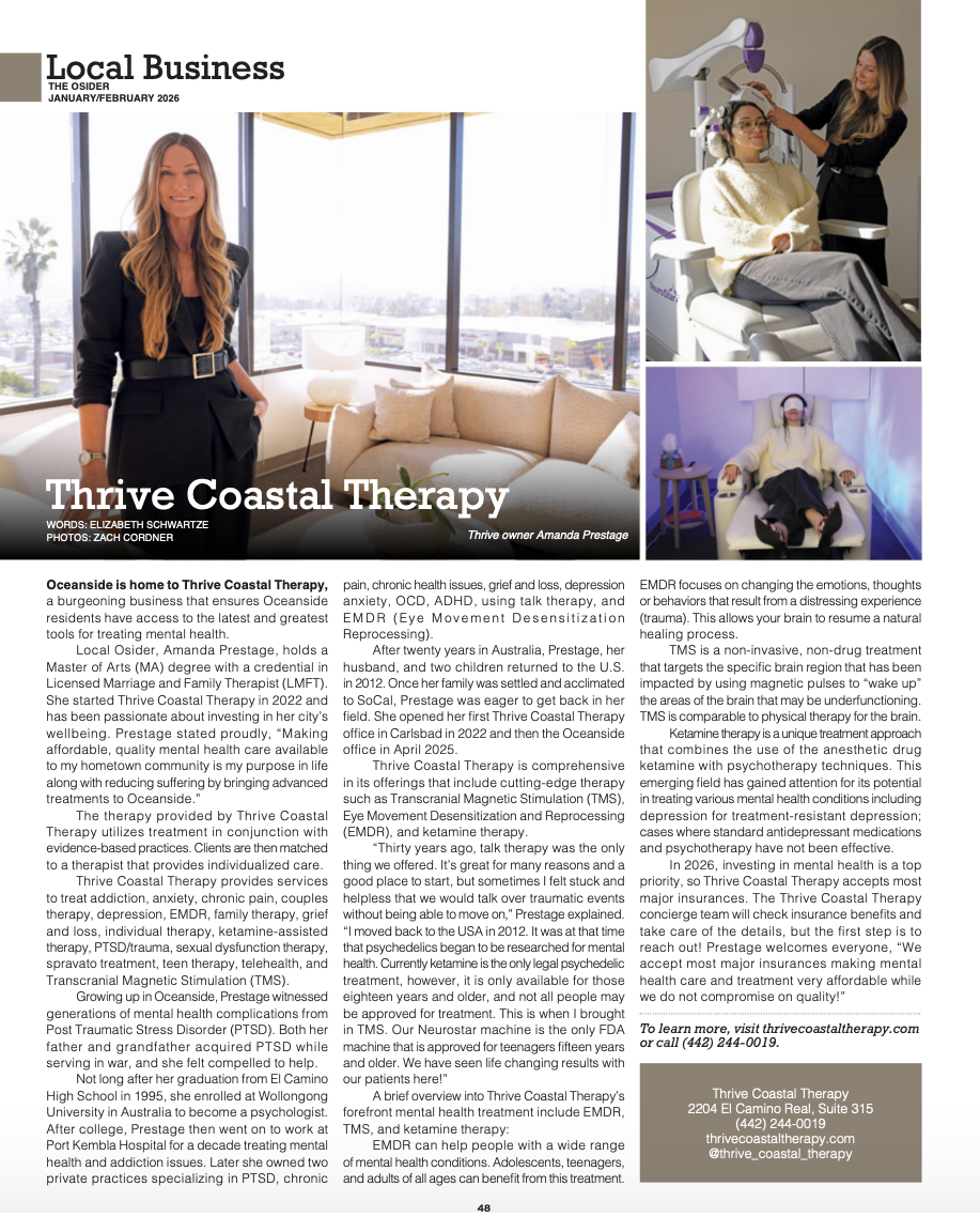 We are so honored to be asked to be apart of the Jan/Feb 2026 issue of the Osider Magazine. It has been a dream of Amanda Prestage CEO/Founder/LMFT to bring mental health treatment to her hometown community. She opened her second location in Oceanside|CA in April of 2025 following the opening of her first location in Carlsbad|CA in 2022. Being a child of a Veteran who served in the Marines for over 25 years, she saw first hand how mental health can impact loved ones and have a ripple effect on families and communities. Bringing advanced treatments (such as TMS, EMDR, Psychedelic Assisted Psychotherapy) to her Oceanside hometown community has been a dream of hers since she moved abroad in 1996. Amanda believes taking a holistic, collaborative approach to treatment is critical to reduce symptoms and treat diagnosis like: Depression, Anxiety, PTSD/trauma, ADHD, Autism, OCD and Addiction just to name a few.